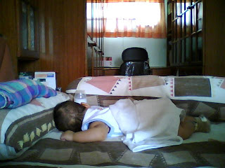 then i play at my mother's room where hes sleeping.. then after playing, i decided to blog him.. haha.. he keep turning here and there... tot hes awake at first.. but no.. hes not.. lol.. when u touch him lightly, he will move sia.. lol..